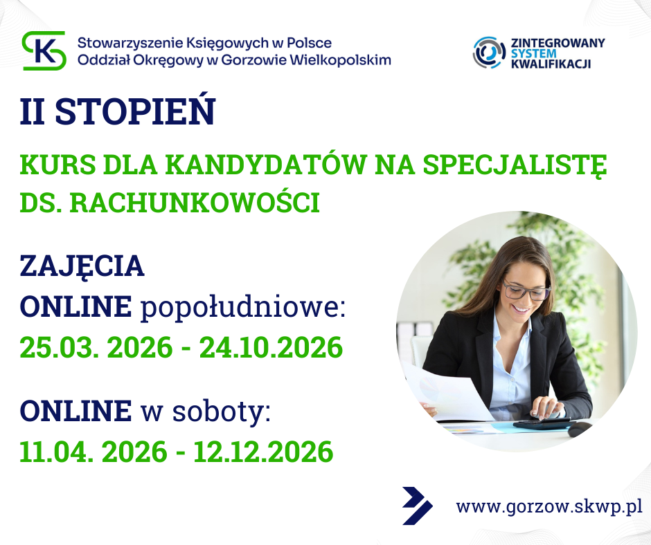 Zależy Ci na nowych, praktycznych umiejętnościach oraz doświadczeniach? Myślisz o rozwoju swojej kariery? Potrzebujesz potwierdzić swoje kompetencje zawodowe? Marzysz o awansie? Serdecznie zapraszamy na KURS DLA KANDYDATÓW NA SPECJALISTĘ DS. RACHUNKOWOŚCI II STOPIEŃ: KURS DLA KANDYDATÓW NA SPECJALISTĘ DS. RACHUNKOWOŚCI 184 godz. lek. Kurs ONLINE w soboty: II stopień: KURS DLA KANDYDATÓW NA SPECJALISTĘ DS. RACHUNKOWOŚCI (184 godz. lek.) - Stowarzyszenie Księgowych w Polsce Oddział Okręgowy w Gorzowie Wlkp. Kurs ONLINE popołudniowy: II stopień: KURS DLA KANDYDATÓW NA SPECJALISTĘ DS. RACHUNKOWOŚCI (184 godz. lek.) ONLINE POPOŁUDNIOWE - Stowarzyszenie Księgowych w Polsce Oddział Okręgowy w Gorzowie Wlkp. Serdecznie zapraszamy udostępnij